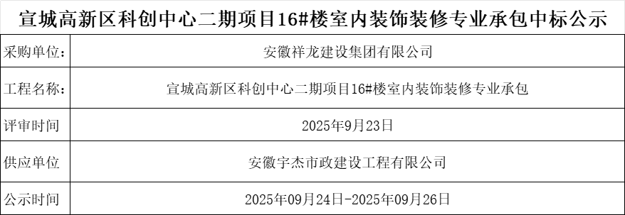 宣城高新區(qū)科創(chuàng)中心二期項(xiàng)目16#樓室內(nèi)裝飾裝修專業(yè)承包中標(biāo)公示
